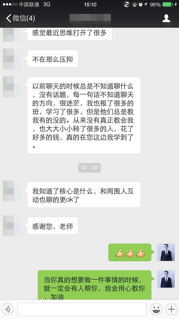 在20天前,你们看到的徐同学,是一个人称“话题终结者”的大屌丝,海峰导师的私人定制课程帮助他改善了聊天困境,才有了今天的这一篇文章,徐同学能做到,你为什么不行?